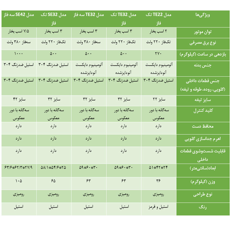 در طراحی چرخگوشتهای صنعتی امگا ایرانی، استفاده از موتورهایی با توان بالا اهمیت ویژهای در عملکرد و بازدهی دستگاه دارد. موتور چرخگوشتهای نیمهصنعتی با توان 2 تا 3 اسب بخار و موتور مدلهای صنعتی با توان 3 تا 7.5 اسب بخار تولید میشوند. بسته به سایز تیغه، توان موتور و نوع منبع تغذیه، بازدهی این چرخگوشتها بین 270 تا 1000 کیلوگرم در ساعت متغیر است. این بازدهی چشمگیر از مهمترین مزایای رقابتی چرخگوشتهای امگا صد صنعت در مقایسه با سایر برندها به شمار میرود. تیغه چرخگوشتهای امگا صد صنعت ساخت ایتالیا و از جنس استیل ضد زنگ 304 برای دوام بالاتر و عملکرد بهتر ساخته شده است. جدول زیر شامل مقایسهای جامع از چرخگوشتهای امگا صد صنعت است. توضیحات و مشخصات دقیق هر محصول در صفحهی مربوط به هر محصول قابل مشاهده میباشد.